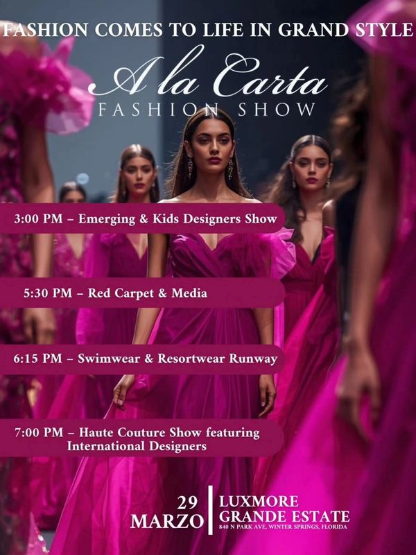 Orlando Fashion Week announces: March 29, 2026 A la Carta Fashion Show 2026 (Orlando). A la Carta Fashion Show 6th Annual International Runway shows A celebration of fashion, art, and elegance in Central Florida (including Kids Runway Showcase & Emerging Designers Runway Show) in collaboration with Orlando Fashion Week.